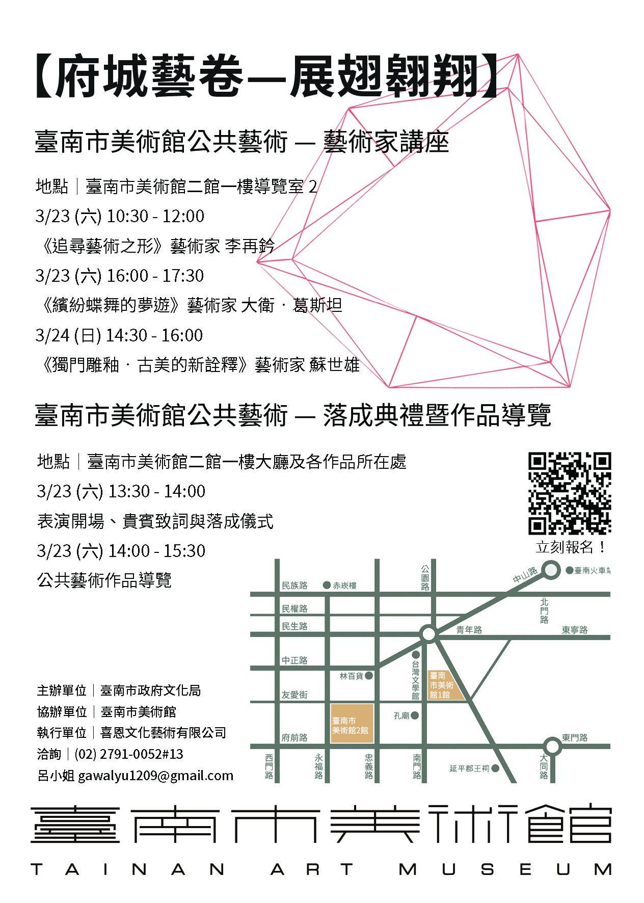 3/23-3/24將辦理臺南市美術館公共藝術落成典禮以及藝術家導覽與講座,本館公共藝術作品包括:日籍藝術家中谷芙二子所創作《雲朵#46741》、以色列籍藝術家大衛‧葛斯坦《輪飛蝶舞 悠遊時光》、臺灣藝術家李再鈐《天地人和》以及蘇世雄《絢爛南國 虹彩夢幻》。導覽活動將由創作者向民眾介紹本館戶外公共藝術作品,講座則邀請藝術家蘇世雄、大衛·葛斯坦、李再鈐分享其創作理念及歷程。凡網路報名並參與活動者,會後將贈送精美小禮物,每場次限額40名,歡迎參加。