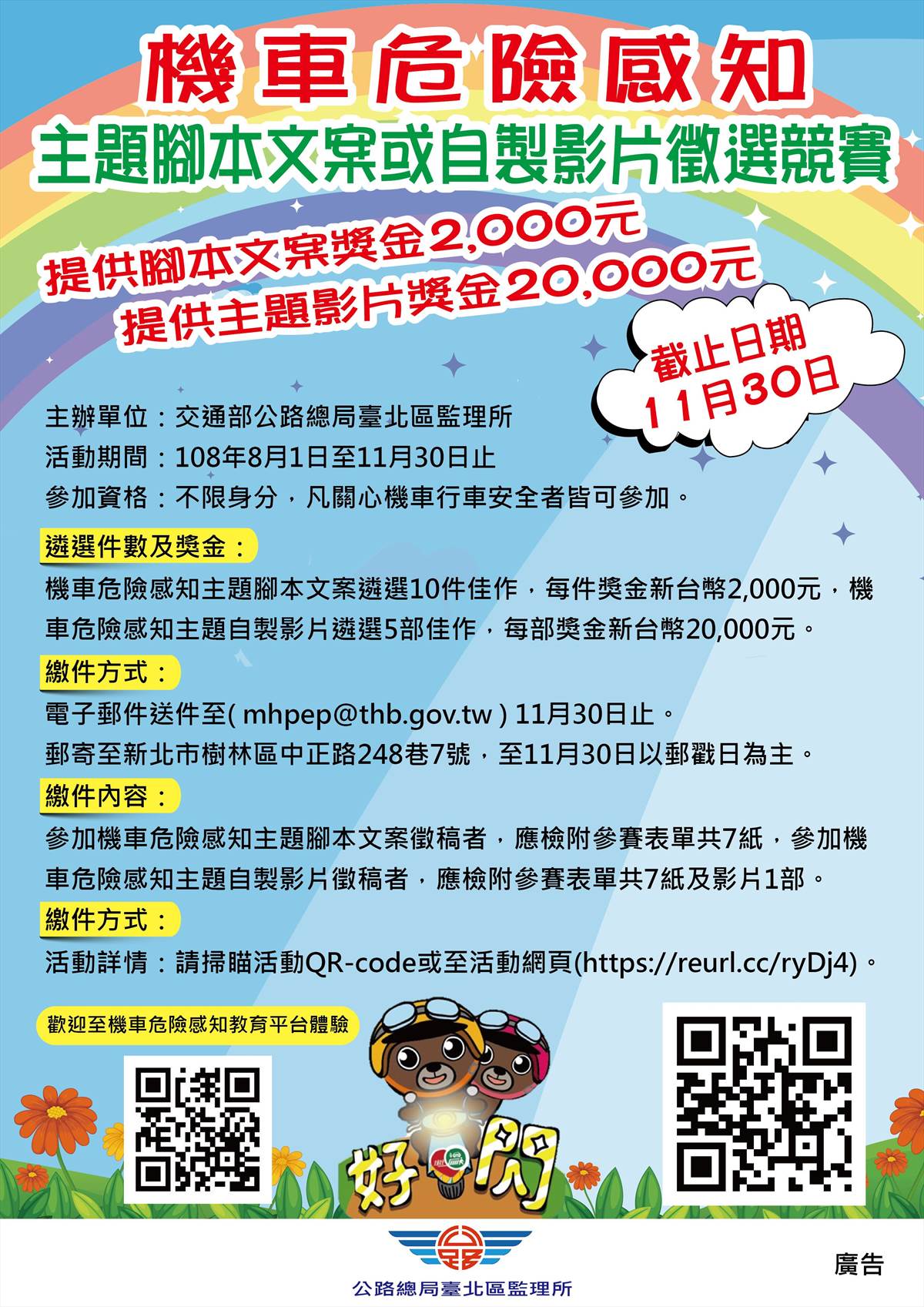 「機車危險感知教育平台」影片設計徵選競賽,總獎金高達新臺幣12萬元