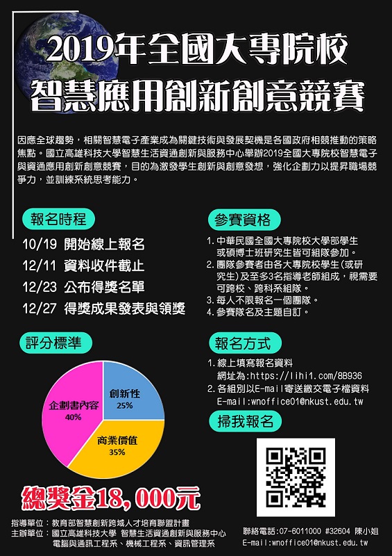 「2019年全國大專院校智慧應用創新創意競賽」歡迎學生踴躍報名參與!
