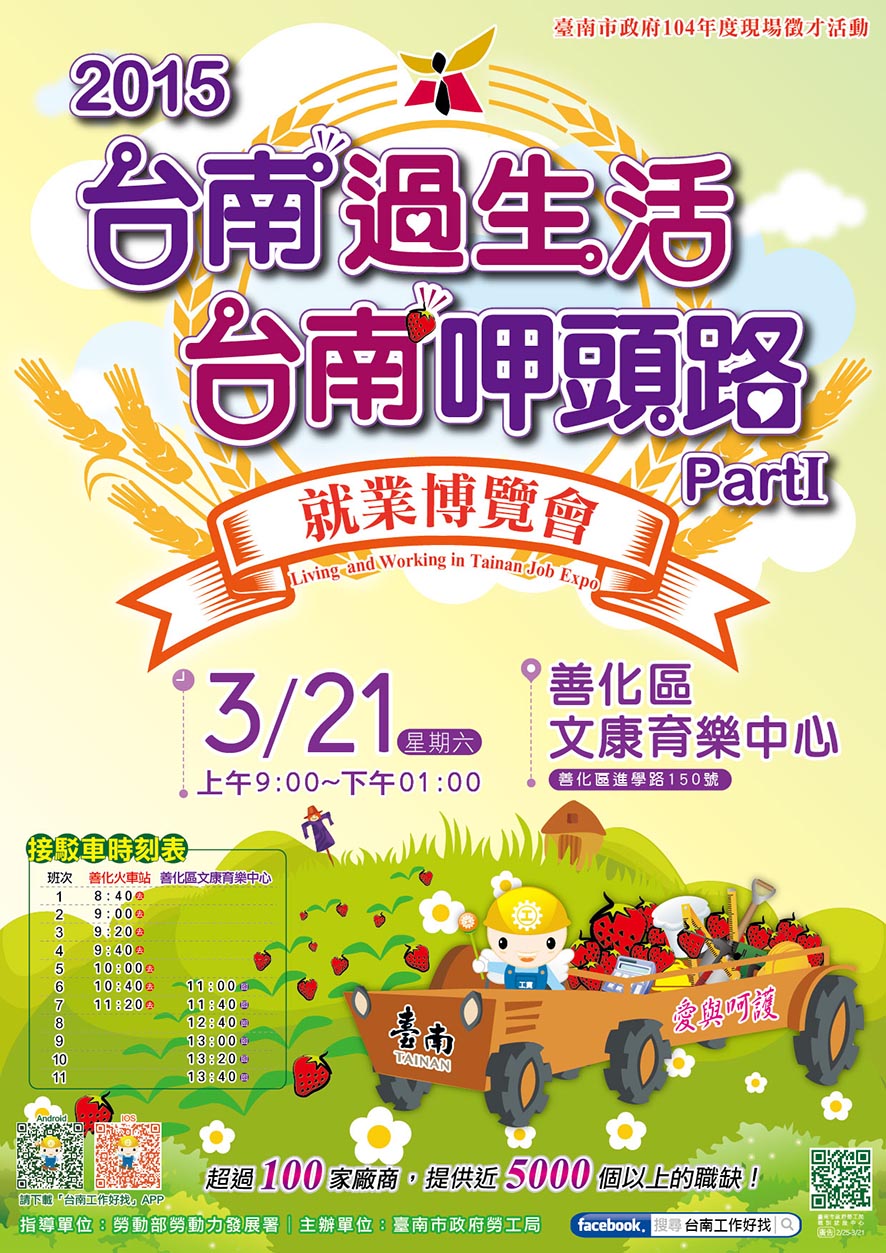 | 主旨:臺南市政府勞工局職訓就服中心將於3月21日假善化區文康育樂中心辦理104年度第1場大型徵才活動-2015「台南過生活 台南呷頭路」part1就業博覽會 | ||||
