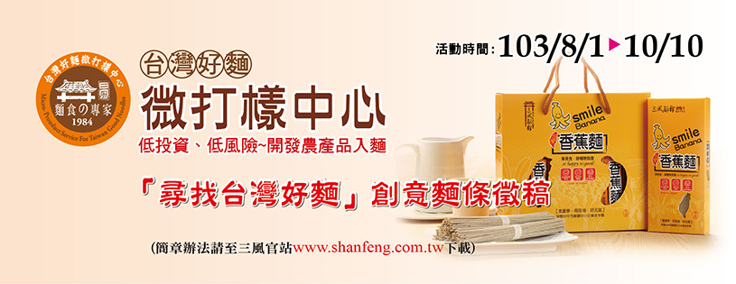 三風食品,秉持[食當季、用在地、好元氣]的經營理念,成立只要5kg即可製造具客製化特色的麵條伴手禮之《台灣好麵微打樣中心》協助想發展農產品加工成客製化麵條的大家,以最低的投資風險來進行市場測試;未來從銷量與價值面的雙向提升,創造出台灣農產品的市場新應用商機。