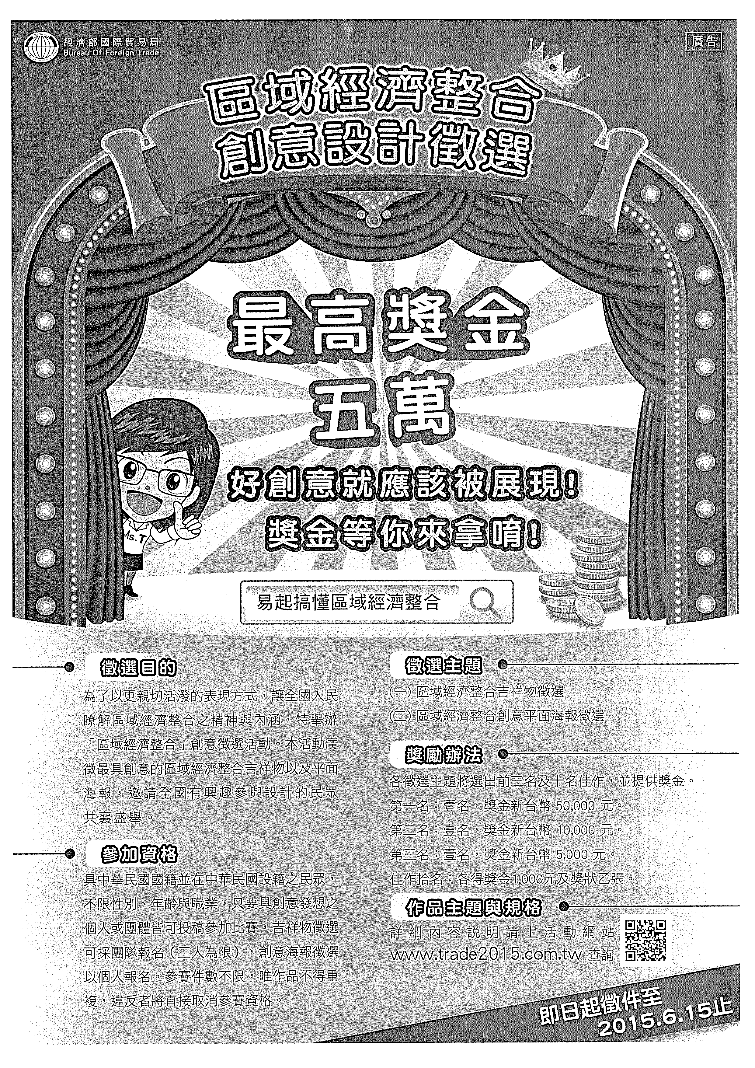 區域經濟整合創意設計甄選」,即日起徵件至本(104)年6月15日止