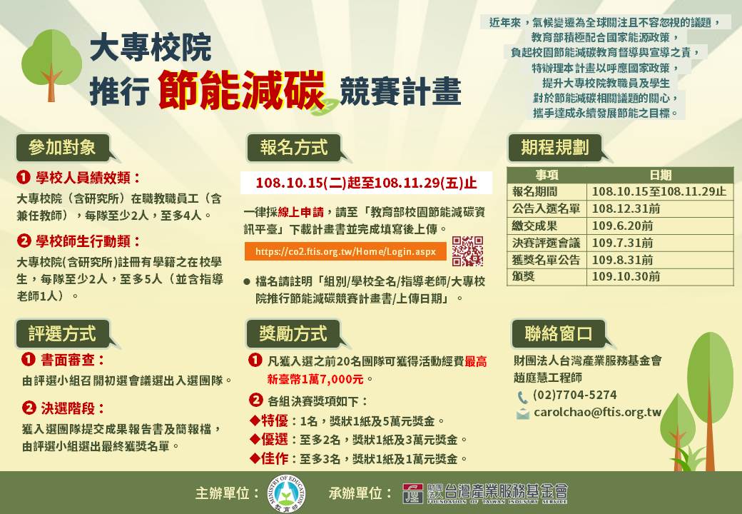 教育部第1屆「大專校院推行節能減碳競賽計畫」,邀請大專校院教職員工及學生組隊來報名參加,結合班級、系所、行政人員或社團,融入「永續發展、氣候變遷、節能創意、循環經濟」之主題提出計畫,以實踐本次活動主題的創新作法,並將創意落實減碳於校園生活中。