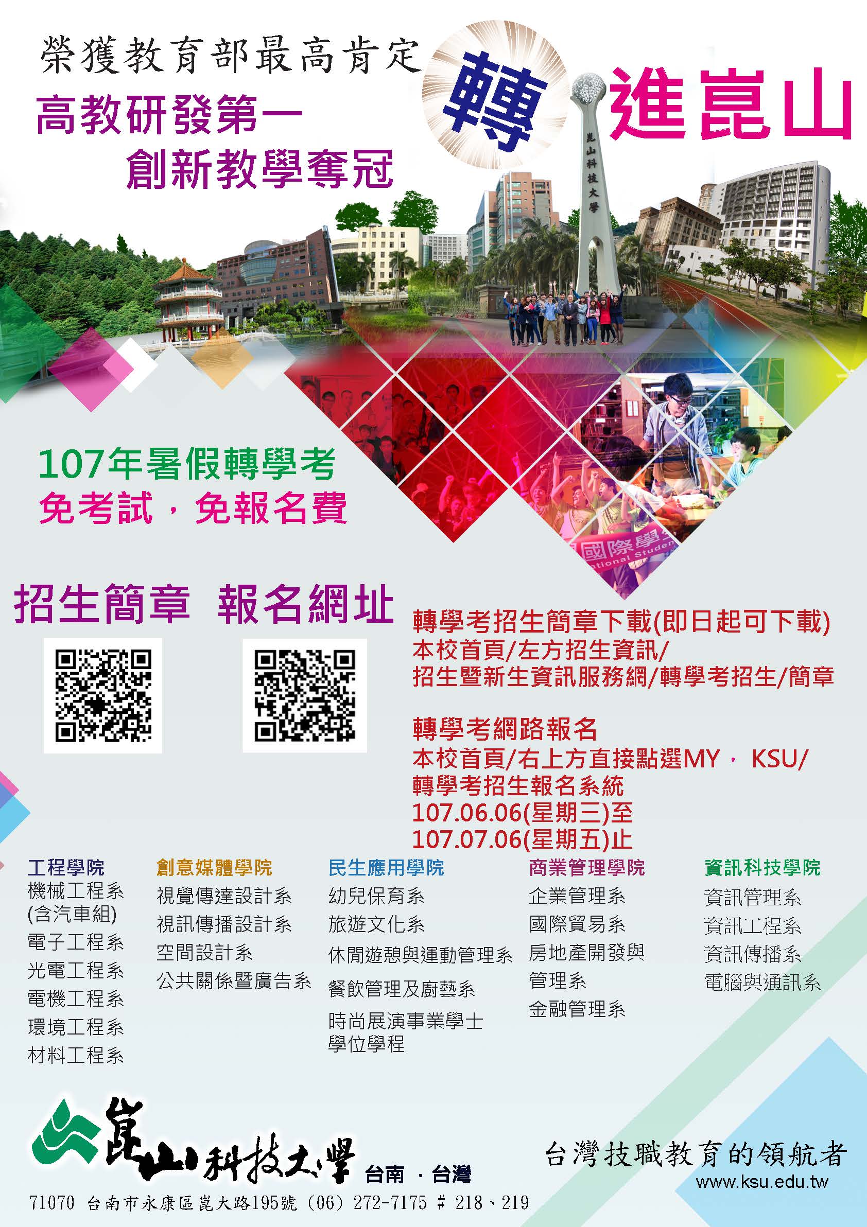 崑山科技大學 107 學年度第一學期日間部暨進修部(含在職專班)轉學考招生訊息