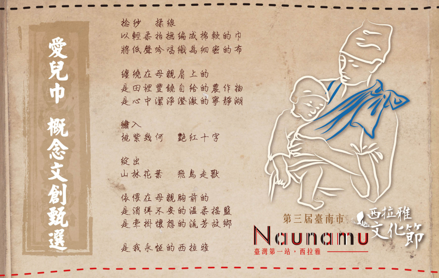 不限形式、顏色、材質、方式,能深刻了解西拉雅母子圖中愛兒巾所代表之意涵,並對愛兒巾懷有創意。