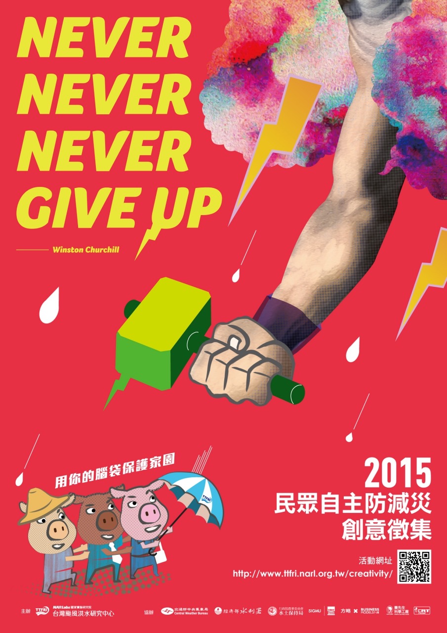 為培育颱洪科技人才,財團法人國家實驗研究院台灣颱風洪水研究中心(以下簡稱颱洪中心)於2014年首次舉辦「民眾自主防減災創意徵集」活動,提供有志人士表現自我的舞台。參賽者以自身所學與創意,提出民眾可以自主操作的防減災技術或概念,並透過活動引導將這些想法逐步落實。有了去年的迴響,今年將擴大舉辦,除了將原單一組賽制,改成服務類與商品類兩組。參賽者可自行依防災創意選擇參賽組別,參賽制度改變了,不變的是資歷與經驗豐富的評審群,及主辦單位努力將防災創意付諸實現的決心。