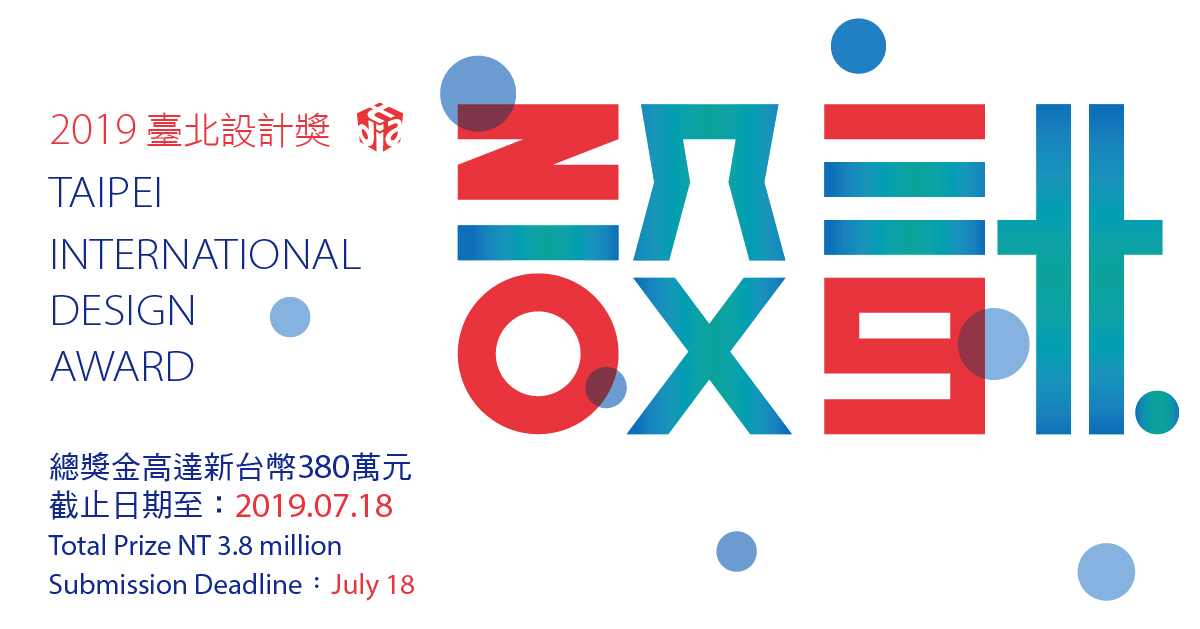 即日起徵件至7月18日止。類別包含工業設計、視覺傳達設計、公共空間設計三大類, 各類金獎獎金最高50萬,總獎金高達新台幣380萬元,並設有跨領域臺北市長獎獎金60萬、社會設計15萬、應用精進15萬、通用設計獎15萬等大獎。